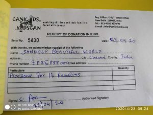 1. Snehalaya Cancer Home which is managed by Can Kids Foundation has 17 families and 45 people.The home provides accommodation to around 20 pediatric Cancer patients who come to Chennai for treatment along with parents. Sankalp Beautiful World provided 1 month Groceries as requested by the foundation to feed the children’s and families at Can Kids,Chennai.This was funded by Mr.Chella Babu working at Dow Chemicals.
